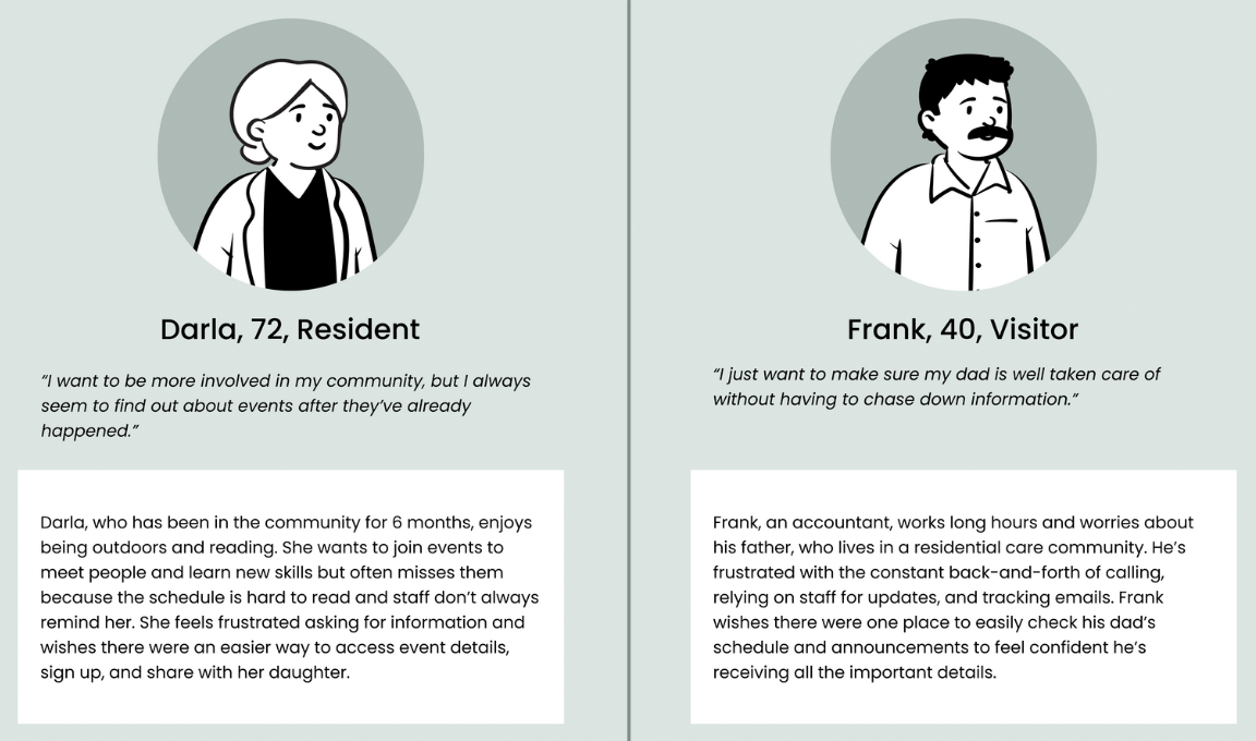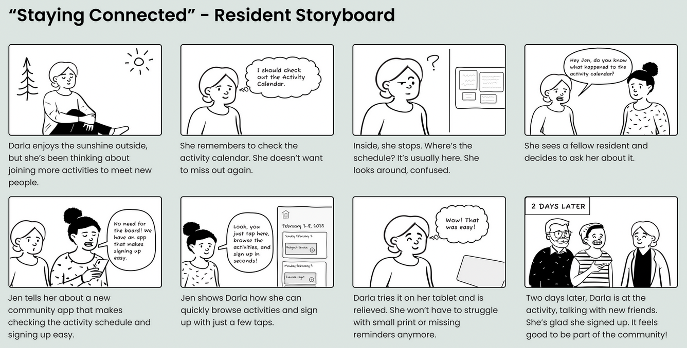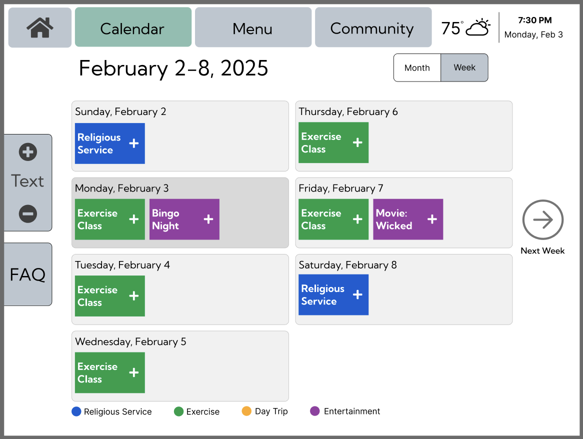 Gather’d is a product designed to house community information for residential care–it serves as a directory that guides residents through various tasks, such as viewing lunch menus, signing up for new clubs, and interacting with fellow residents.